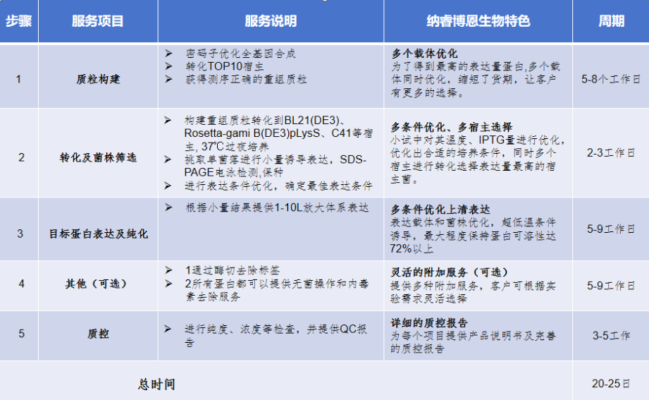 1、 交付周期:小规模表达验证 7-14 个工作日,纯化交付 10-21 个工作日(视复杂度调整)。